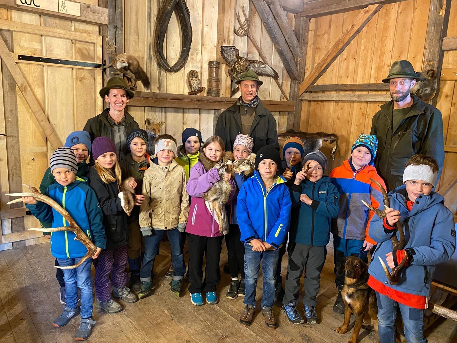 Besonders begeistert waren die Kinder von den Tierpräparaten, die es ihnen ermöglichten, Reh, Fuchs, Dachs und andere Waldtiere aus nächster Nähe zu betrachten. Auch die Bedeutung der Fütterung im Winter wurde kindgerecht erklärt – warum sie notwendig ist, welche Futterarten verwendet werden und wie man so das Wild unterstützt, ohne es zu sehr an den Menschen zu gewöhnen.