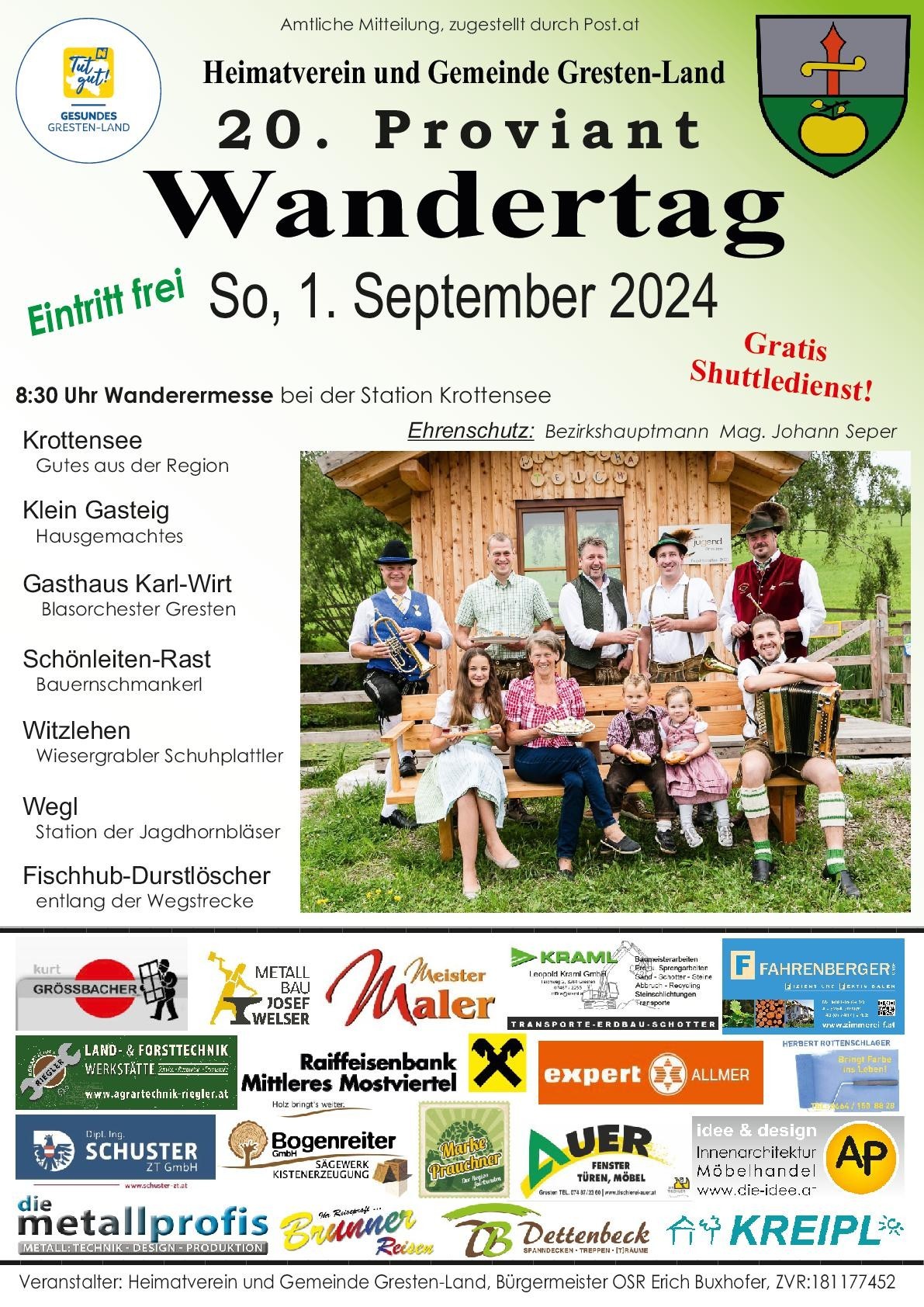 Bei den Stationen wird es hausgemachte Bauernschmankerl, musikalische Unterhaltung und ein tolles Kinderprogramm geben. Die Stationsbetreiber sowie der Heimatverein Gresten-Land freuen sich auf euren Besuch beim Proviantwandertag.