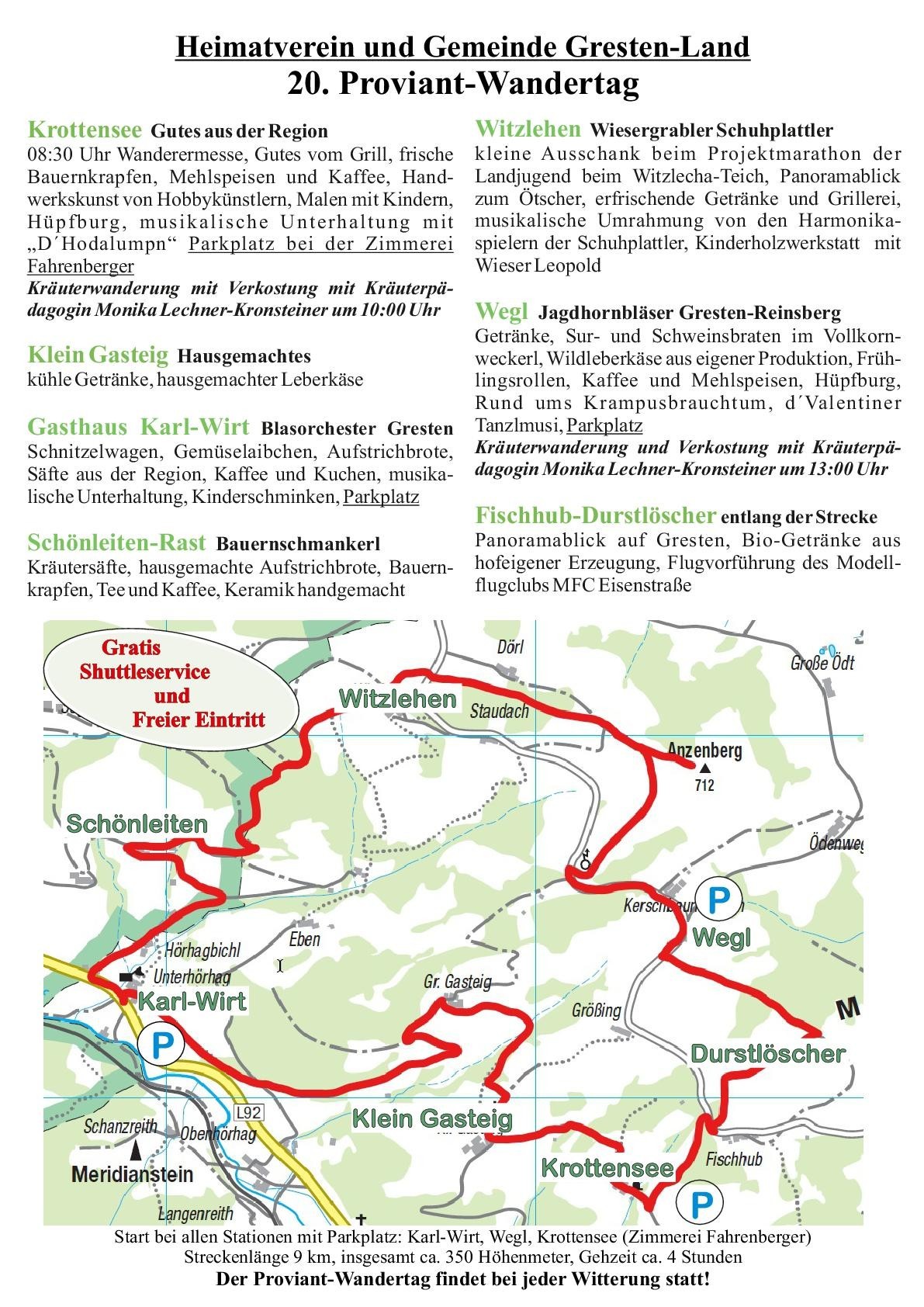 Der Proviantwandertag findet heuer das 20. Mal statt. Die Route führt, wie auch im Vorjahr über den Mitterberg und starten kann man bei den Stationen Karl-Wirt, Wegl und Krottensee. Um 08:30 Uhr wird eine Wanderermesse bei der Station Krottensee abgehalten.