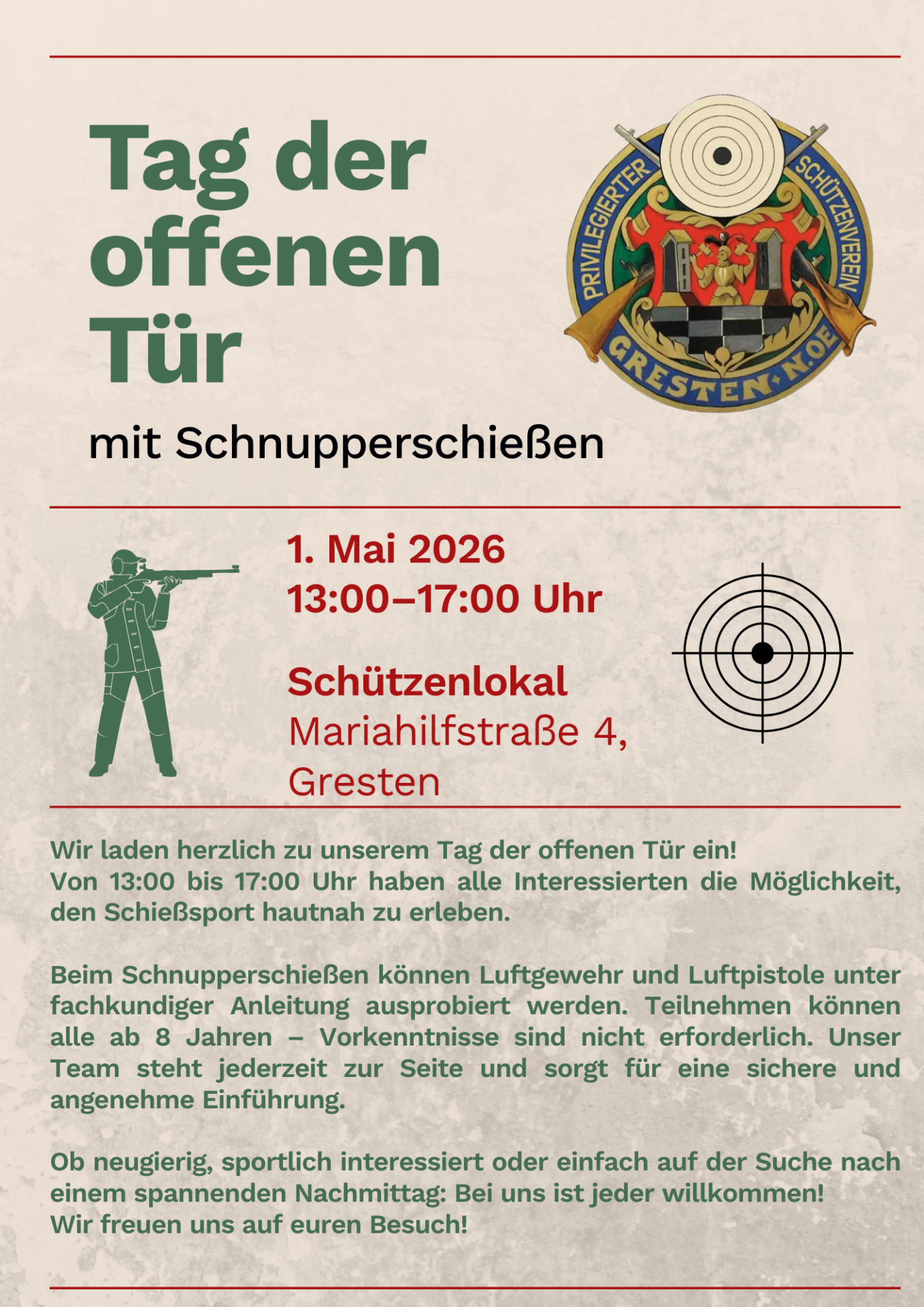 Am 1. Mai 2026 laden wir herzlich zu unserem Tag der offenen Tür ein! Von 13:00 bis 17:00 Uhr haben alle Interessierten die Möglichkeit, den Schießsport hautnah zu erleben.